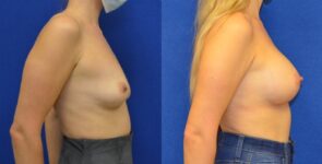 This patient with breast asymmetry wanted breast augmentation. Mentor moderate plus 240 cc on L, 270 cc on R under the muscle (dual plane).