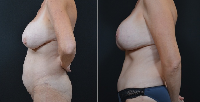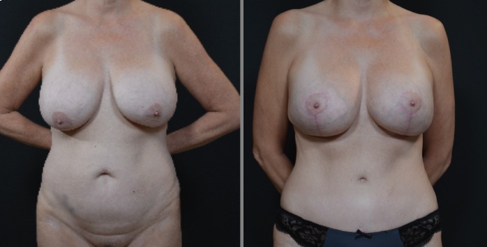 This patient is in her late 40s and wanted improvement in abdominal contour and wanted her implants exchanged with a breast lift (mastopexy). After photos are 3 months post-op. Implants were exchanged from 400 to 350 cc implants, and from saline to silicone. She had lost 30 pounds before surgery.