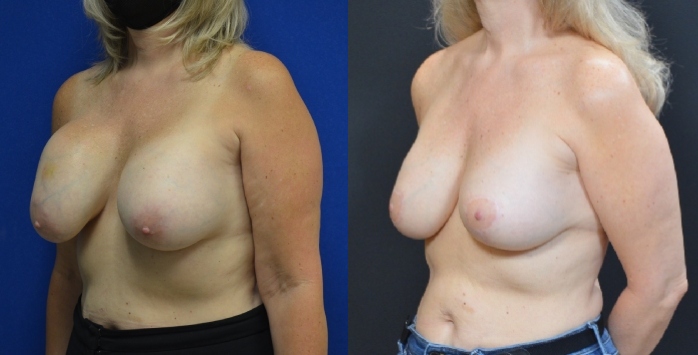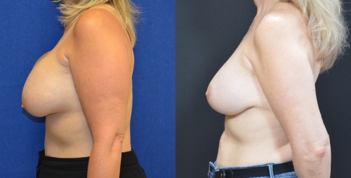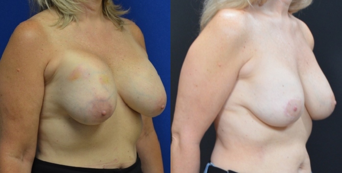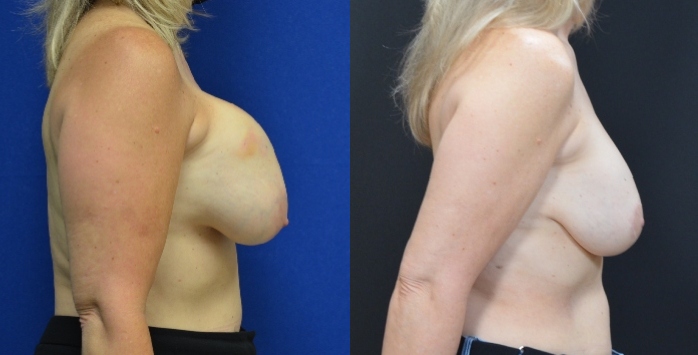 This patient presenting with breast implant rupture in Portland. Implants were over 30 years old. She underwent removal and replacement with smaller, 320 cc moderate profile silicone implants and breast lift.