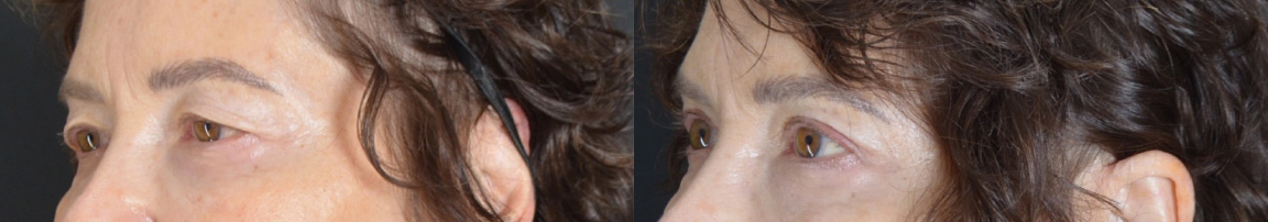 This patient was bothered by loose upper lid skin and underwent an in-office bilateral upper eyelid lift and internal browpexy in the office under local anesthesia. She is seen 3 weeks after the procedure, and still has mild fullness that is expected to improve.