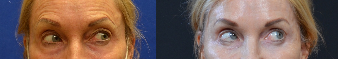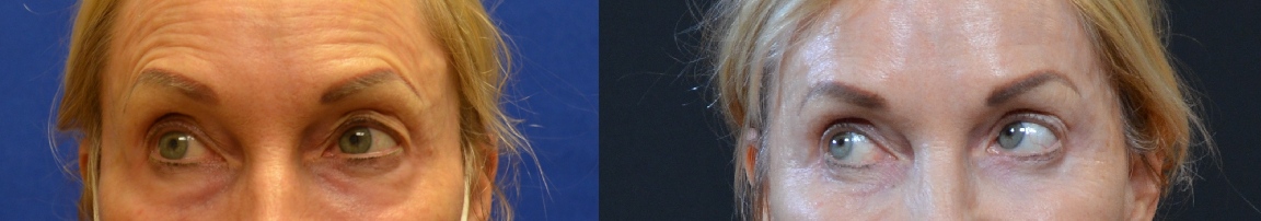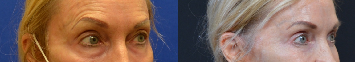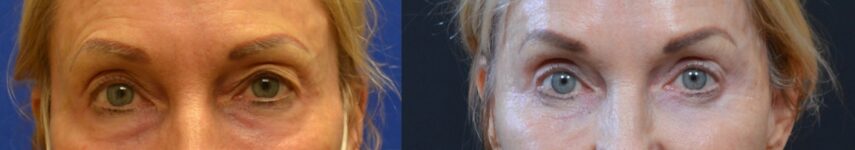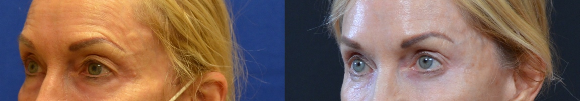 This patient was treated with upper and lower eyelid lift, lateral subcutaneous brow lift, and facial fat grafting with chemical peel.