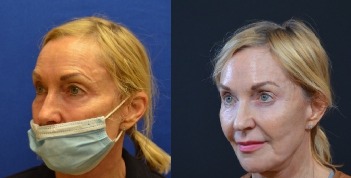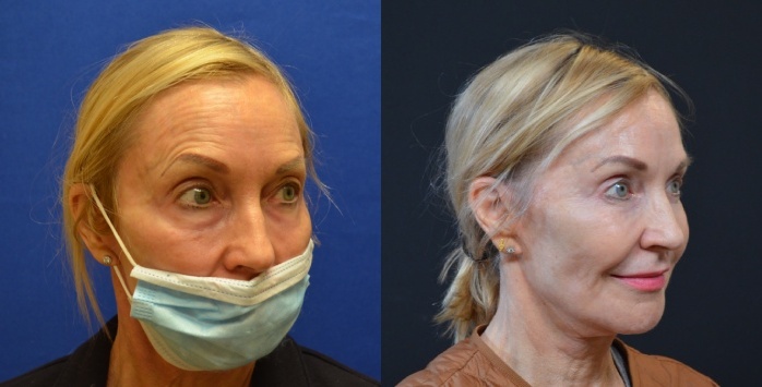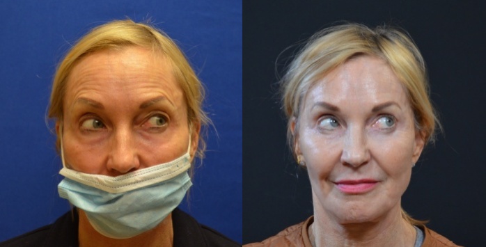 This patient was treated with upper and lower eyelid lift, lateral subcutaneous brow lift, and facial fat grafting with chemical peel.